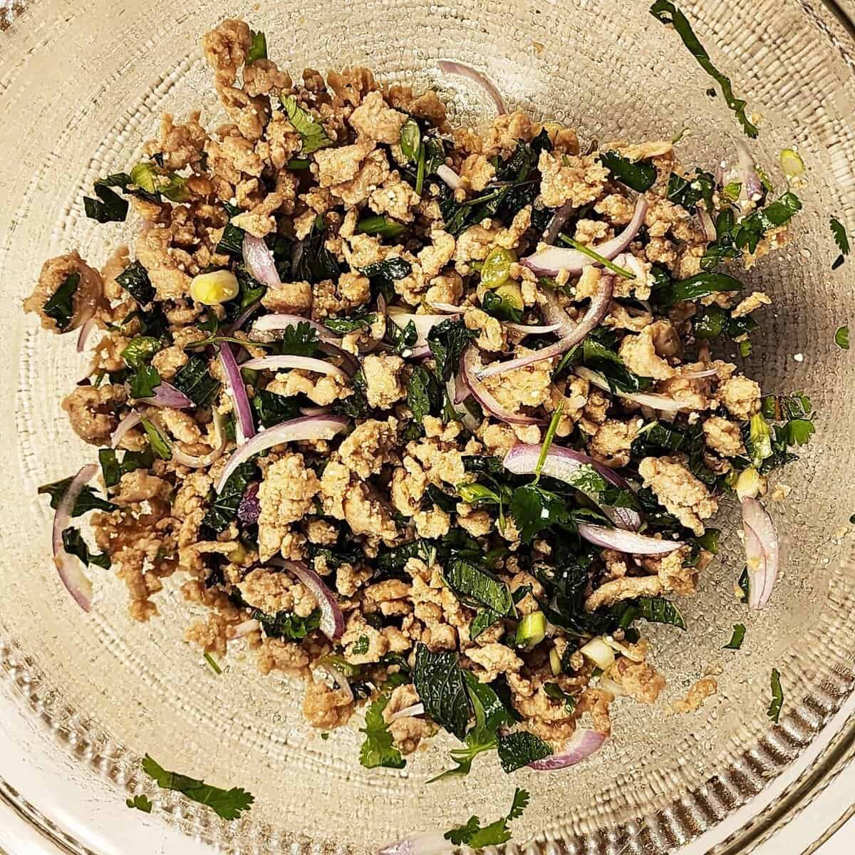 - Toss Salad: Pour the prepared dressing over the chicken and herb mixture. Use salad tongs or two large spoons to toss everything together gently. Ensure the dressing evenly coats all the ingredients, infusing them with the tasty, sweet, and tangy flavors typical of Larb Gai. For those who prefer a milder version, you can reduce the amount of Thai chilies or remove the seeds before chopping.
